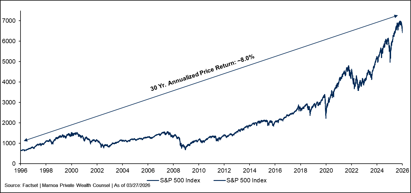 S&P 500 30‑Year Price Return with ~8.0% annualized trendline